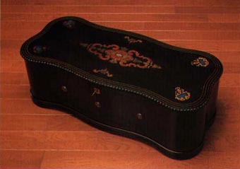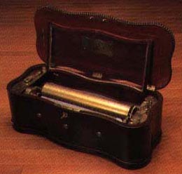 装飾された曲線型のケースにその曲線にそったガラスの内蓋つきシリンダーボックスとしては珍しい。