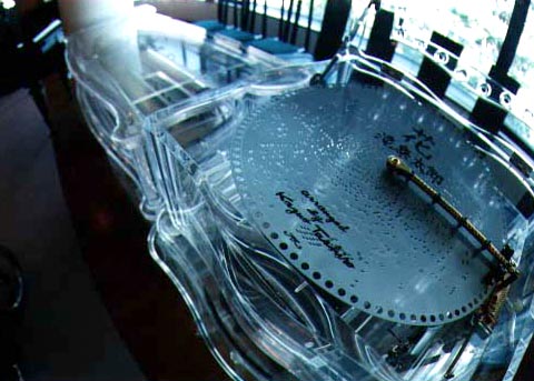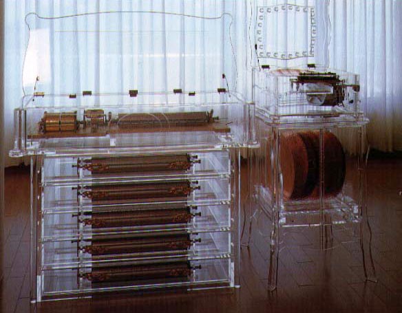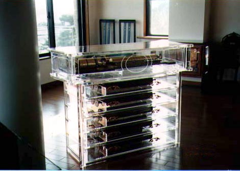 オルゴールの内部構造の実際を見て頂く為に、理事長の発案によりケースを特注製作したものである。